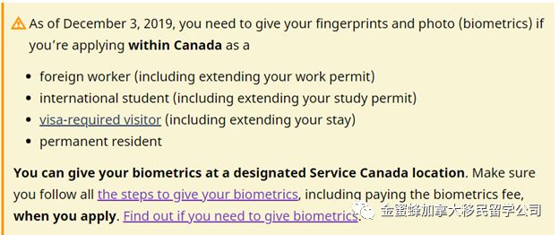从12月3日起,在加拿大境内提交的学习许可(study permit包括续签),工作许可(work permit,包括续签),访问身份延期申请(visitor record),及永久居民申请均需进行生物信息(指纹和图像)采集。
